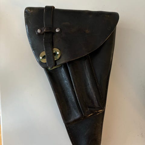 Brunt lærhylster til Husqvarna M40 9mm pistol. Husqvarna M40 ble brukt av de norske politistyrkene i Sverige under krigen, og av det norske forsvaret etter krigen. Hylsteret er med lommer for magasinlader, pussestokk og magasiner. Den ene beltehempen er fagmessig byttet ut i bruksperioden. Hylsteret er i grei brukspreget stand.