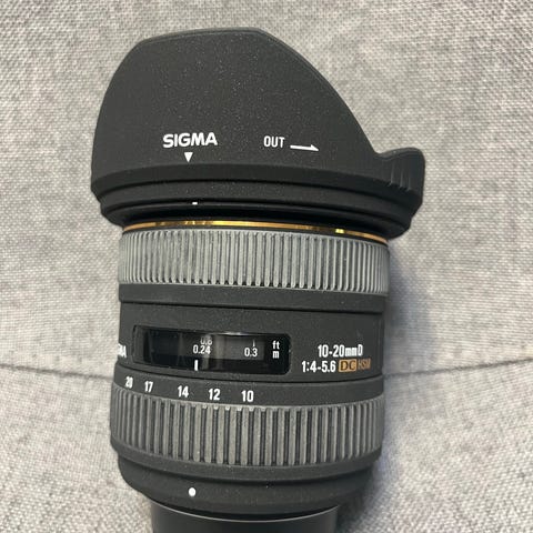 Hei :) jeg selger min pent brukt Sigma 10-20mm f/ 4-5,6 EX DC HSM. Muligens jeg har brukt den 15-20 ganger men vidvinkel er bare ikke noe for meg.