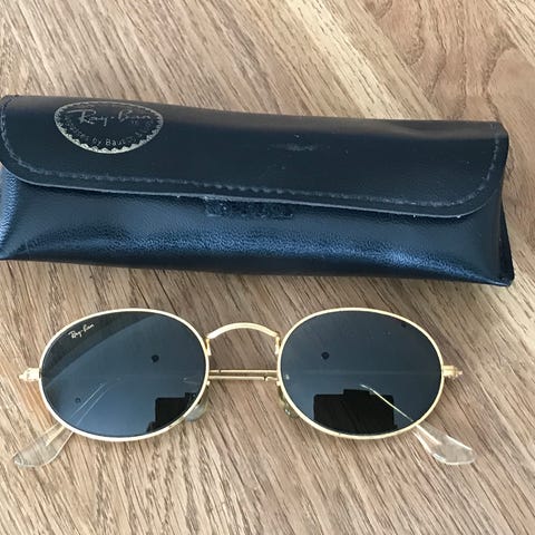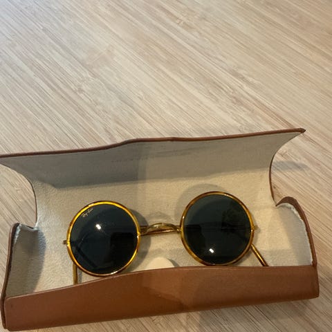 Ray-Ban runde solbriller med gullramme rundt og blågrønn mørk farge i glasset. Ca 30 år gamle men tatt godt vare på og god stand uten skader. 13 cm mellom båger. Sendes mot porto.