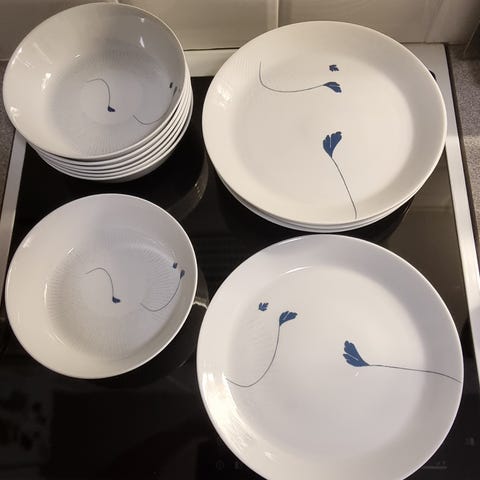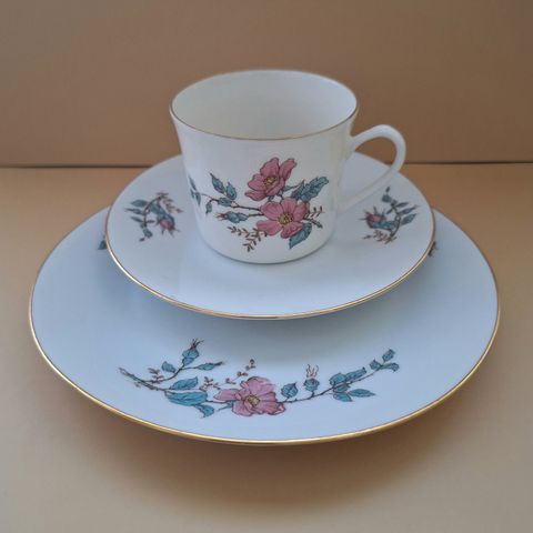 Kaffeservise til seks personer fra Porsgrund porselen selges for 360 kroner (kopp: høyde 6 cm / diameter 8,5 cm. Skål/asjett: diameter 14 cm / 21 cm). K27. Fraktkostnader: PostNord - 129 kroner. Betaling via vipps.