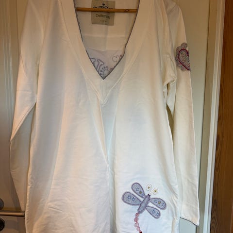 Flott Pont neuf genser med lommer. I flott kakigrønn farve med mønster i svart,hvitt,oransje,gult og korall. Blir for stor for meg.
