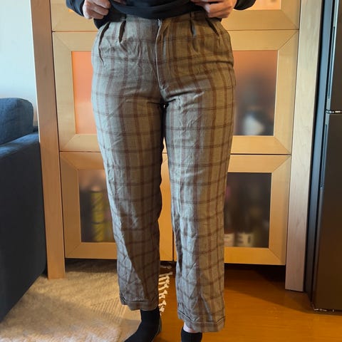 Brun, stripete, vintage bukse selges rimelig. Fin reisebukse. To lommer foran og én bak; slle med glidelås. Str. M. Lukkes med glidelås og knyting. Knyting i beina.