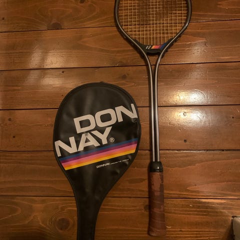 Godt brukt squash racket fra Head. Én av strengene har røket (tredje øverst horisontalt) så den er nok litt slappere enn vanlig, men går fortsatt fint an å spille med.