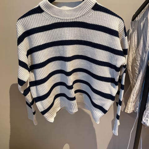 Hvit og blå stripete genser med gullfarget hals. Pent brukt. Må hentes i Kristiansand eller sendes om kjøper betaler frakt.