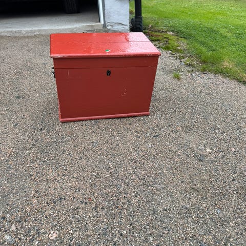 Den har messinglås og stålklyper. Nøkkelen mangler.