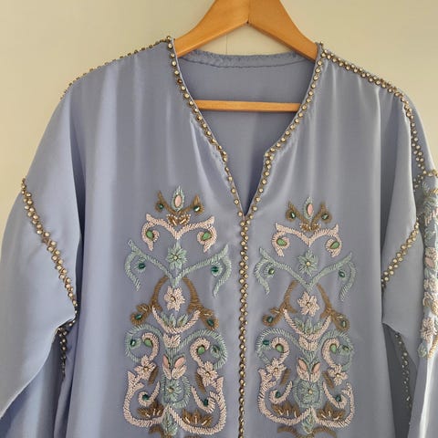 Kaftan i størrelse XL, farget rosa med detaljer i gull og rosa. Kjolen har lange ermer og dekorative broderier langs fronten og ermene. Den inkluderer et belte med broderte mønstre og pynt.