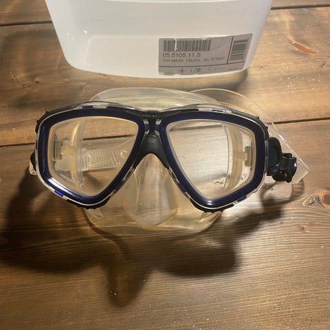 Silicone Ansiktsmaske og første trinn med regulator, blekksprut, trykkmåler og linjer for tørrdrakt og BCD.