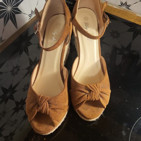 Gode som nye, bortsett fra en liten flik på den ene hælen, se bilder. Semsket materiale.