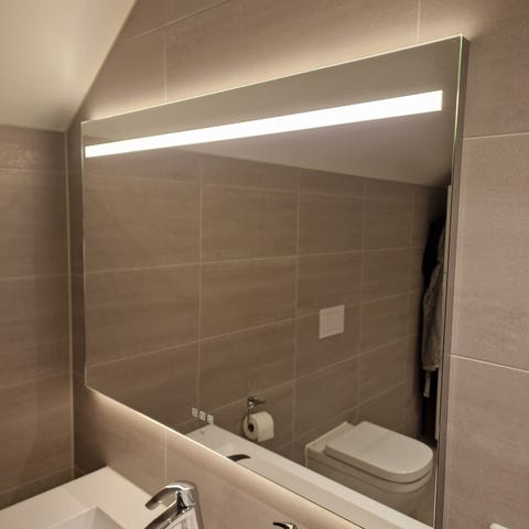 Flott speil fra Fossbad med antiduggfelt og indirekte LED-belysning rundt hele speilet.