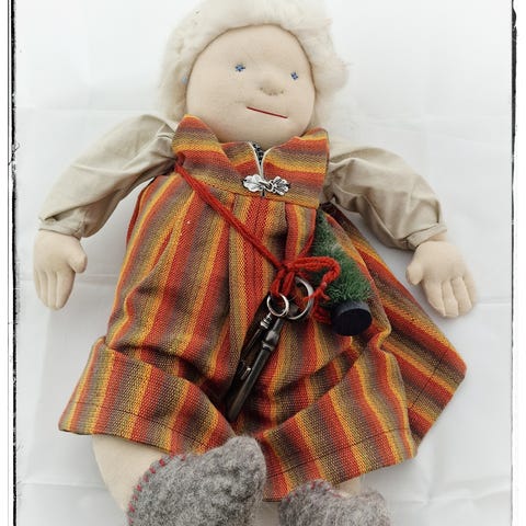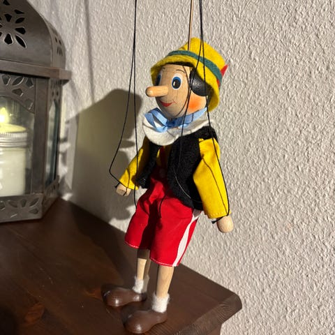 Nydelig Marionette dukke Harlequin. Kjøpt hos dukke maker i Praha 2008. Den har kunn vert som pynt, men fungerer som den skal til “dukketeater” ( underholdning) Den er fint laget, hender hode og føtter i tre….med flotte kler med bjeller. Dukken måler 44 cm høyde, med stang 78 cm. Den ene skoen er limt, da der ble en sprekk etter at den danset litt for mye….😃