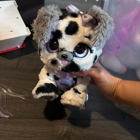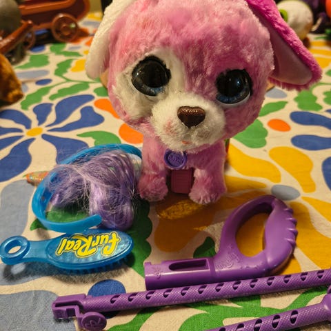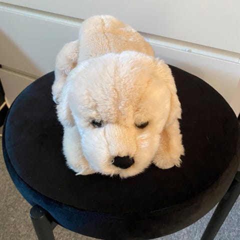 Selger en lite brukt leke hund som går, sitter og tar salto. Går på batterier. Batterier føler med. 17 cm høy, 23 cm lang