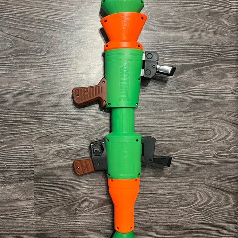 Dette er en Nerf Fortnite RL Blaster (også kjent som Rusty Rocket), inspirert av rakettkasteren fra det populære spillet Fortnite.