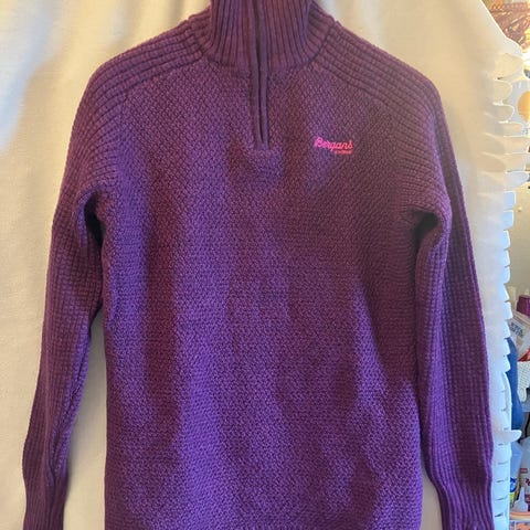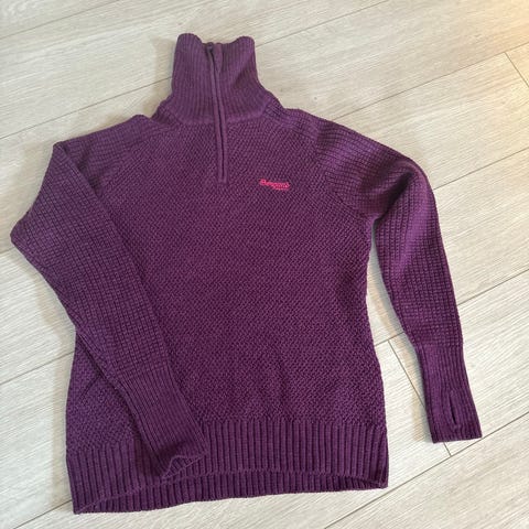 Høghalsa strikkegenser frå bergans. Glidelås i halsen og tommelhull. Perfekt turgenser