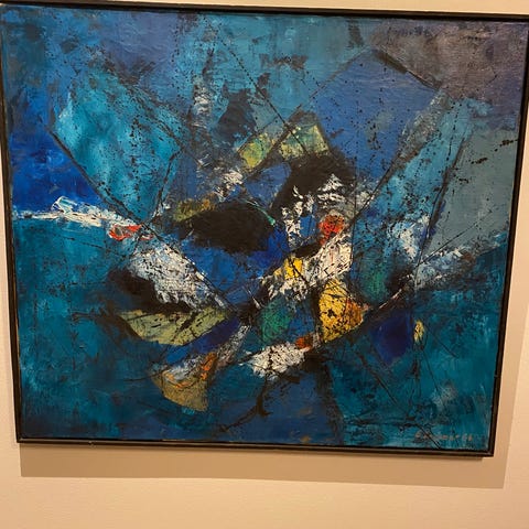 Maleri med sterke innslag av grønt, gult og lyse toner som gir en følelse av levende natur og lysende vekst. Maleriet har en energisk og organisk uttrykksform, inspirert av naturens kraft og fornyelse.