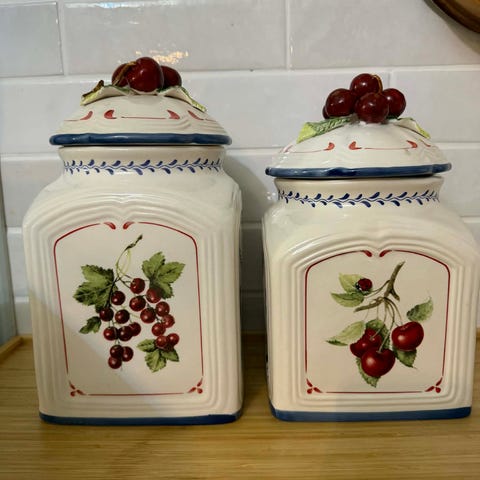 Strøken Cookie jar med kirsebær på lokk. Finner ikke lignende, kun med sitroner eller små i str.