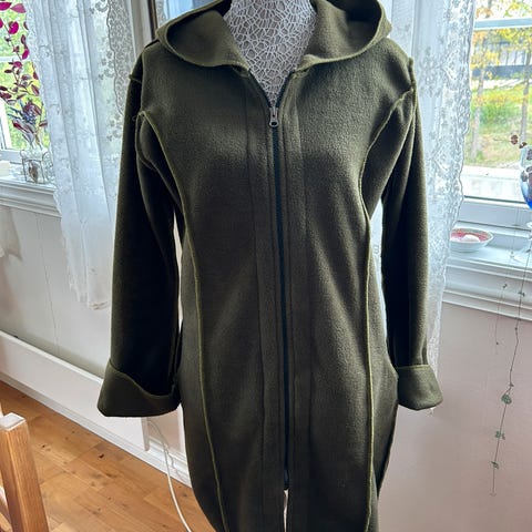 Mål fra skulder 95cm, trykkknapper, hette med snor.