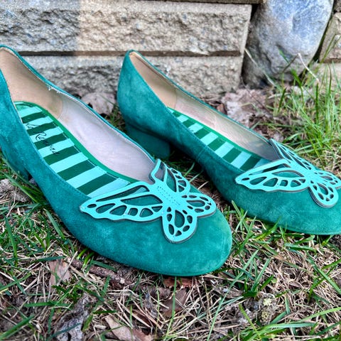 Brukte Tom Ford ballerinasko i slangeskinn med dekorative glidelåser og olivengrønn metallisk farge i meget god stand.
