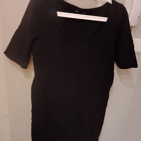 Svart lang genser/topp (kan sikkert brukes som kjole også) str 34 fra H&M. Har litt lette bølger i stoffet etter bruk og et veldig lite hull helt oppe på ryggen. 3/4 armer. Hentes eller sendes mot frakt.