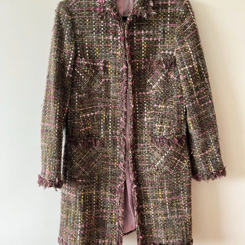 Den er laget av beige tweed med en fargerik, flettet tekstur, med innslag av røde, blå, grønne og lilla tråder - veldig stilig. Kåpen inneholder 37% ull og er foret med 100% viskose, derfor myk og varm.