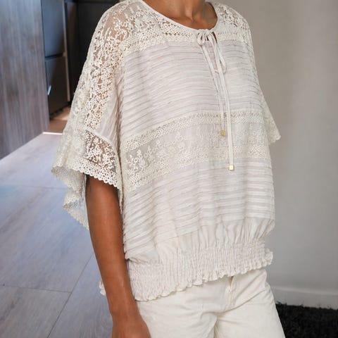 Bluse i engelsk blonde med generøs halsåpning med elastikk, raglanerm med dobbel kappe og ledig passform. Blusen er foret.