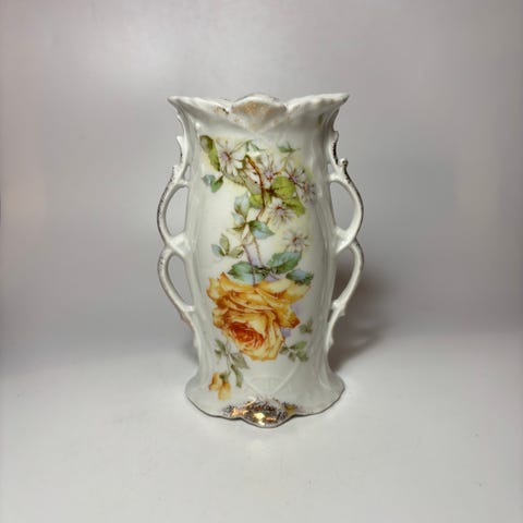Denne søte vasen i porselen er rød-lilla med gulldekor, gull på hanker og kanter, og fine romantiske motiver på begge sider, innrammet av en gullbord. Den er formet som en urne. Vasen er merket under med «FOREIGN», og jeg tipper den er fra 1960-tallet. Kanskje italiensk? Vasen er pen uten skår eller nagg, noe slitasje på gullet på hankene. Se bilder! Høyde: 10,5 cm. Bredde: 8 cm. Diameter åpning: 5 cm. Diameter under: 4 cm. Vekt: 138 g.