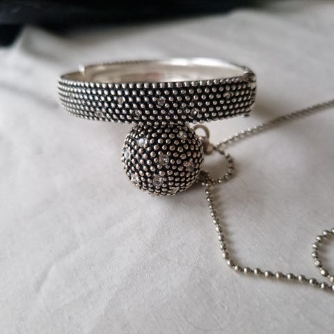 Selger et sett med halskjede og armbånd fra Arts & Crafts, kjøpt for mange år siden. Alt er fint og ser helt nytt ut, bortsett fra en liten skade på en perle, som vist på bildet. Halskjedet er av lær og kommer i eske.