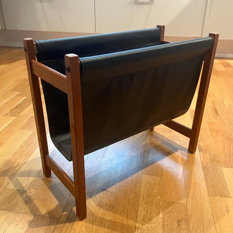 Retro avis/magasin kurv. Sort tre og skinn/skai (usikker)