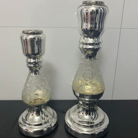 Te lysestake i sølv med speil og hjerter