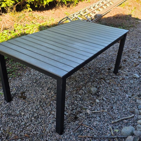 Spisebord Hillmond fra Brafab Selges. Bordet heter Hillmond og er fra Brafab. Bordet er laget av sortlakkert aluminium og har uttrekksfunksjon med én plate. Overflaten på bordet har et preget tremønster. Målene er: Lengde 160/200cm. Bredde 100cm. Høyde 73 cm. Bordet har aldri blitt brukt. Kun montert etter å ha ligget i eske nylig, men har noen transportskader. Bordet selges grunnet plassmangel. Bordet har en ripe og tre trykkmerker i topplaten. (Se bilder) Kan hentes i Moss.