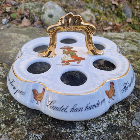 Antikk eggoppsats «konen paa landet» fra PP. med fire originale glass. Er et hakk i ene eggeglass et (se bilde).