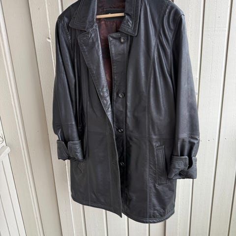 Retro Fritala marineblå skinnjakke. Det står str 40, men er nok mer str 38. Lite brukt, litt skrapt på høyre erne, ellers lite av bruksmerker. Selges kr 800.