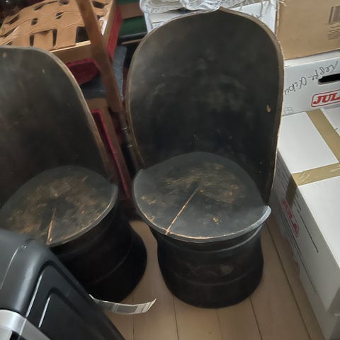 2 stk kubbestoler. Selges 500,- pr. Stk. Veldig gamle, men vet ikke hvor gamle. Begge er sprukket, men d er sjarmerende og kan også fylles og males over.