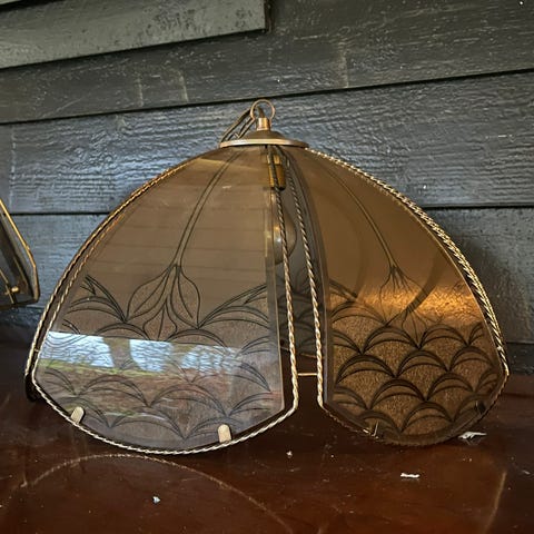 Spesiell og tidstypisk lampe fra 60-tallet. Med innerkuppel i amberfarget glass og messingfarget skjerm er denne et flott blikkfang over for eksempel spisebordet.