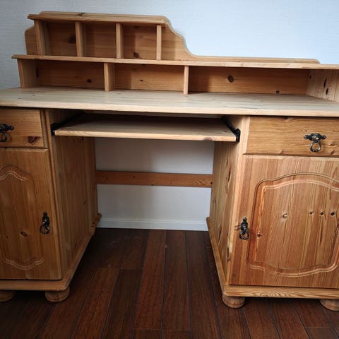 Gedigent skrivebord av dansk fabrikat. Laget på 80-tallet. Meget pent brukt, ingen synlige merker. Skuffer og dører beveges ubesværet. Dørene og noen av skuffene kan låses. Kan deles i fire enheter for flytting.