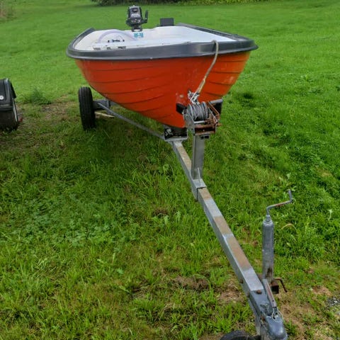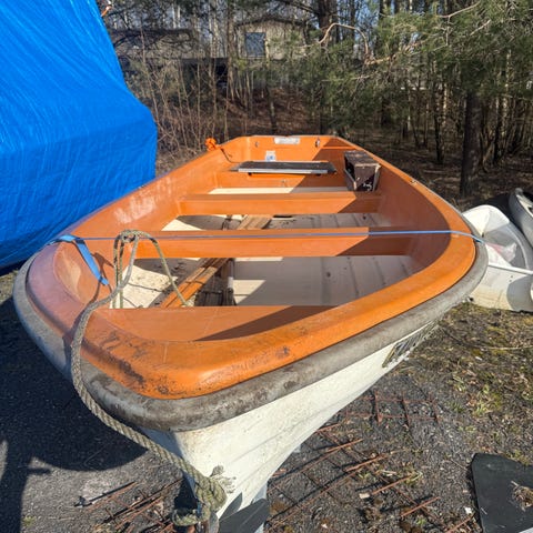 Har låge utfor hytta i noen år, men ser ut som den er i brukbar stand enda, tror d er en gammel therry 8 fot, følger med årer å tolleganger, god å lett å ro, går ann å sette motor på den, men mangler treplater til å feste motor på PRISEN ER 2000 ingen vits å prøva å pruta eller få an gratis