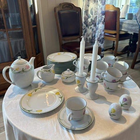 Det er kopp med tefat. Har også 4 tefat ekstra. Ved kjøp av alle koppene fåes de 4 tefatene gratis med.