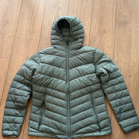 Pent brukt blå, nesten sjøgrønn, jakke fra Jotunheim. Lett dunjakke.
