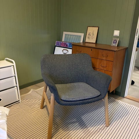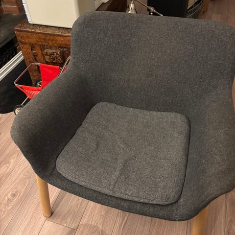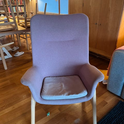 Pent brukt lenestol fra IKEA. Mer info om den aktuelle stolen finnes her: https://www.ikea.com/no/no/p/vedbo-stol-med-hoy-rygg-gunnared-mork-gra-10424131/