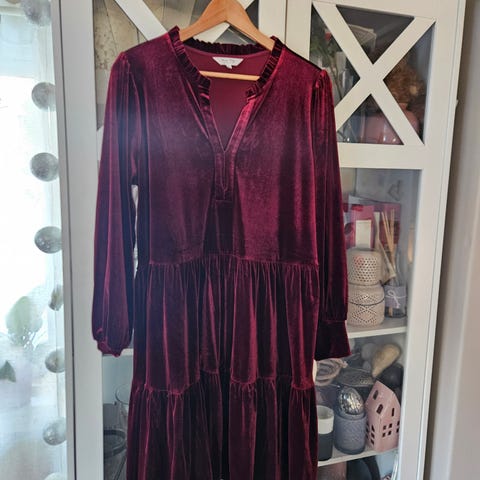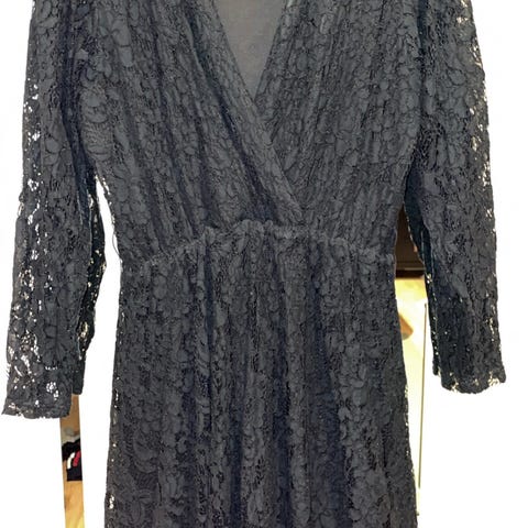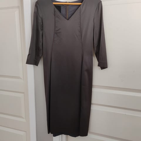 Nydelig kjole, figurnær i burgunder farge. Kjolen er i spedd svart og kan virke både dyp rød cerise aktig i fargen. Laget i materiale med litt stretch som gjør det meget god å gå med.