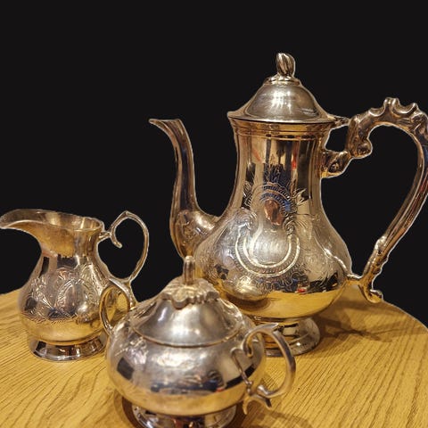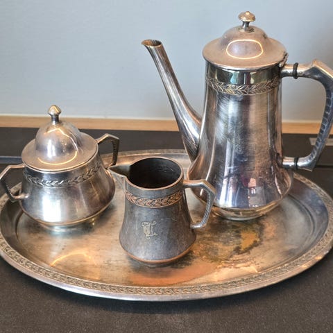 Et nydelig EPNS kaffesett, belagt med sølv.