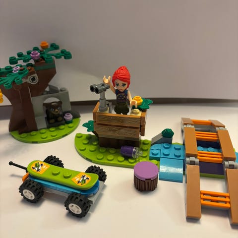 LEGO Friends 41363 Mia's forest adventure selges. Utgått modell! Komplett sett som bl.a. består av Mia figur med hjelm, vannflaske og fjernkontroll, en bjørn, en frosk, skateboard, utkikkstårn og bro. Smart funksjon for å senke bikuben ned og gi den søte bjørnungen tilgang til honning.