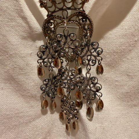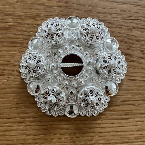 Nydelig bunadsølje selges. Merket med Otteren 925. 7 cm i diameter.