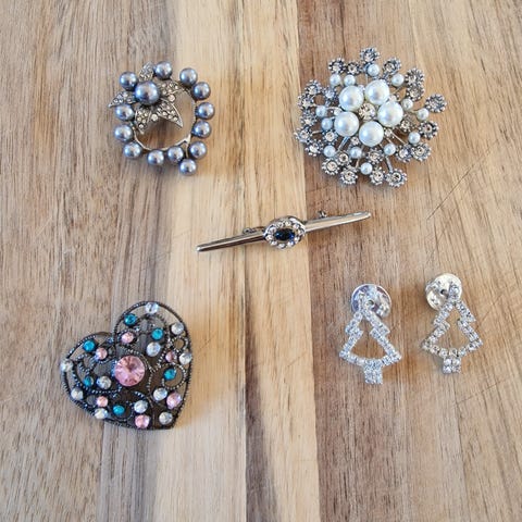 5 par gamle klipsøredobber. Stort sett plast og uedle metaller. De lange mangler en sten. Selges samlet.