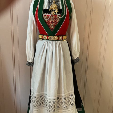 Pen vinterbunad fra Voss selges. Inkludert kortermet original skjorte, hel bunad og sølvlenke (1m). Brukt til høyde 164 cm, str s/m. Kan syes ut/inn.