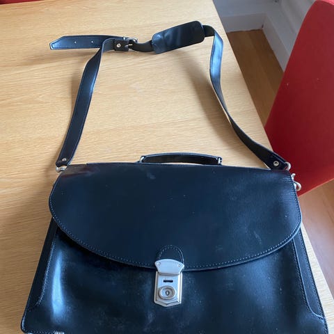 Sort skinnveske fra Italia. Den har to rom med glidelås i tillegg til et på utsiden.