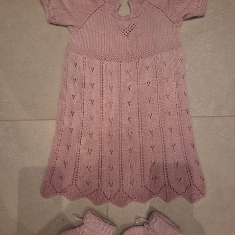 Utrolig fin, strikket kjole. Jeg er litt usikker på størrelsen, men den passer trolig str. 74–80. Min datter brukte den én gang da hun var 13 måneder, og den passer fortsatt nå når hun er 18 måneder.