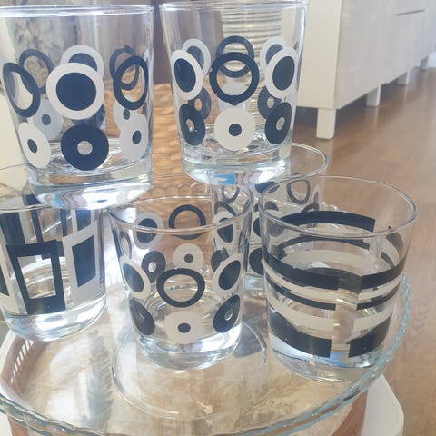 Stilrent sett med 11 glass med moderne svart-hvitt design.