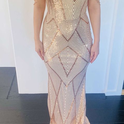 Blek rosa med paljetter. Kjøpt ny på Ann-Zelda brudesalong i mars 2025. Brukt 1 gang.