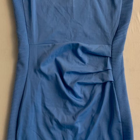 Kjolen har et tidløst snitt med V-hals foran og bak, halvlange ermer og dekorative ribbestrikkede paneler langs skuldre og sider som gir en flatterende passform. Lukkes med langt glidelås bak. Perfekt til både jobb, middag og selskaper.