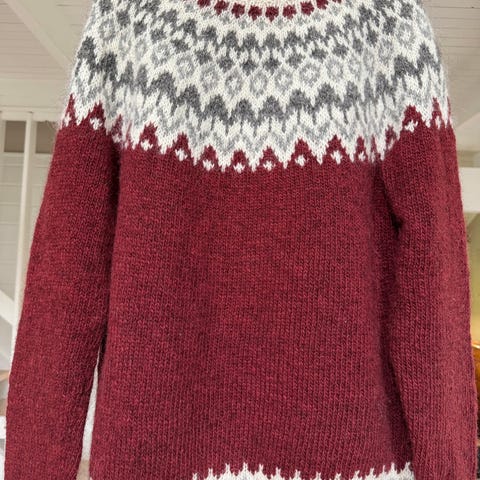 Nystrikket Alafoss Lettlopi-genser. Hel overvidde 105cm, hel lengde fra hals 63cm, lengde arm fra under arm 45cm, lengde målt fra under arm 43cm. Vendestrikket høyde i nakken for passform.